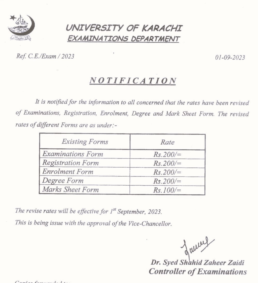 Revised Rates of Examinations, Registration, Enrolment, Degree & Mark Sheet Forms