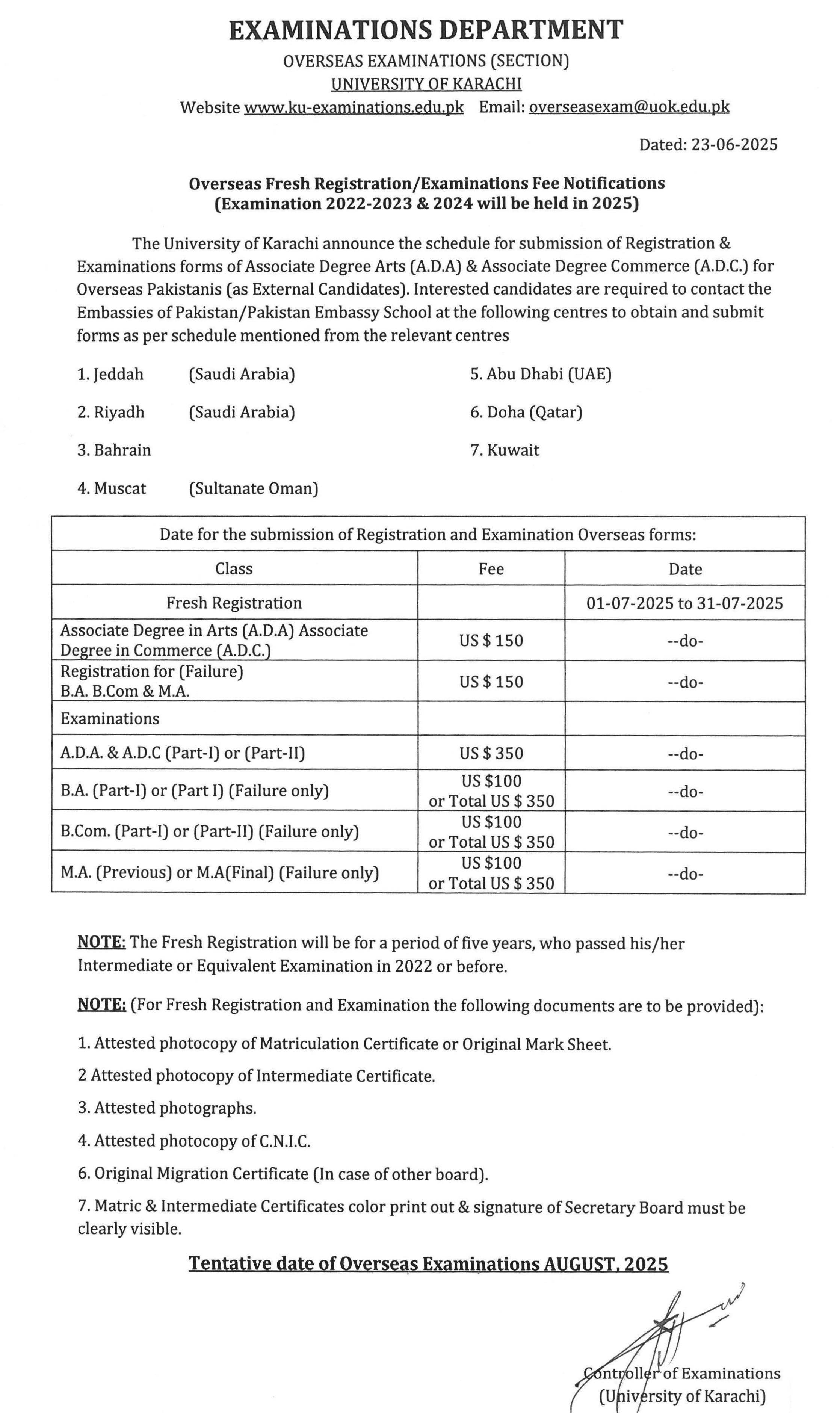 The Office plays an important role in conducting exams for expatriate Pakistanis living in Middle East i.e. (Abu Dhabi, Bahrain, Doha (Qatar), Muscat, Jeddah, Kuwait & Riyadh. The exams are conducted at the Embassies of Pakistan & Pakistan International Schools with the help of contractual staff or with the help of the embassy staff. The schedule of various exams is given on the Schedule page