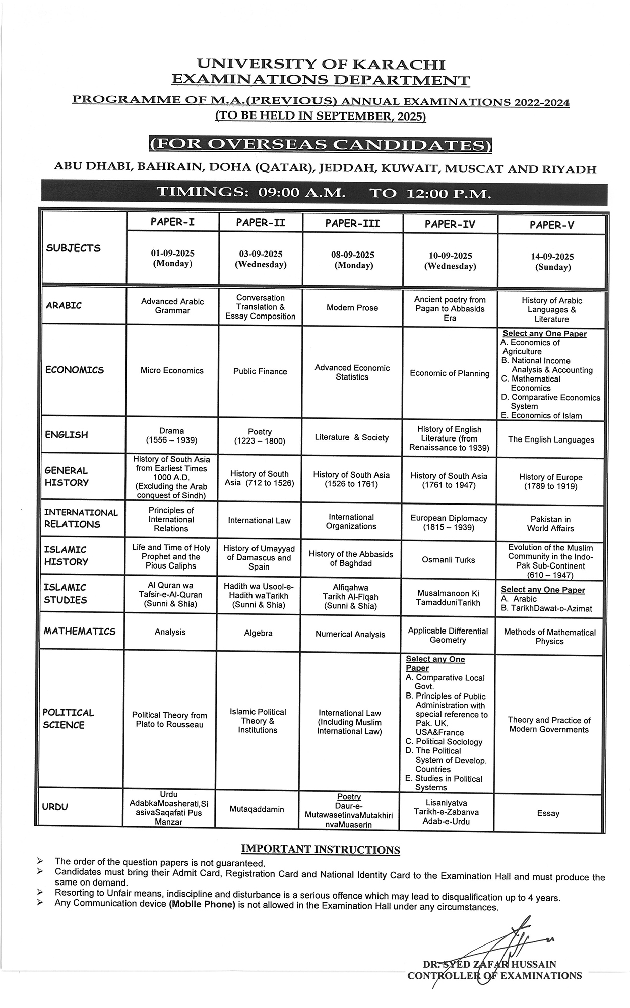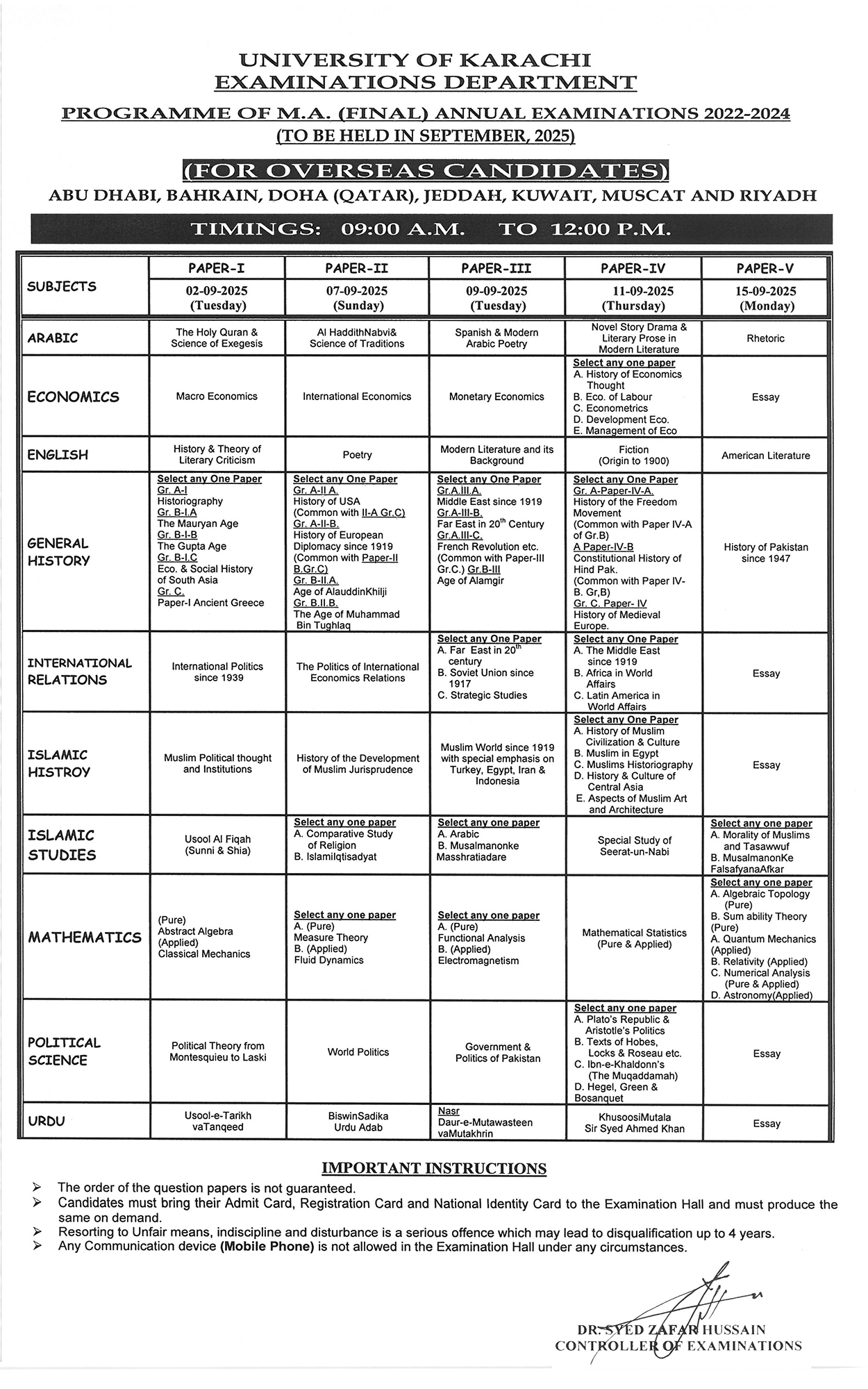 PROGRAMME OF M.A. (FINAL) ANNUAL EXAMINATIONS 2022-2023-2024