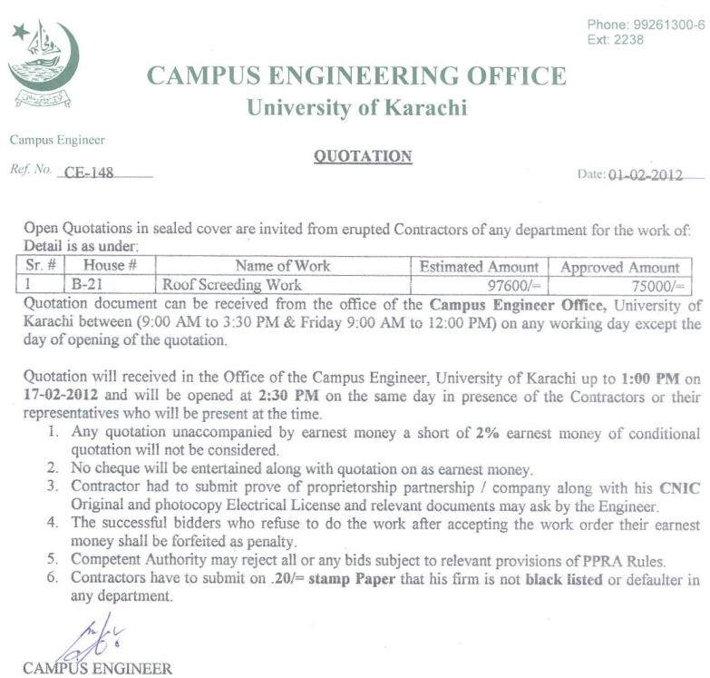 Dated : 02/02/12 Quotation invited for Roof Screeding work |