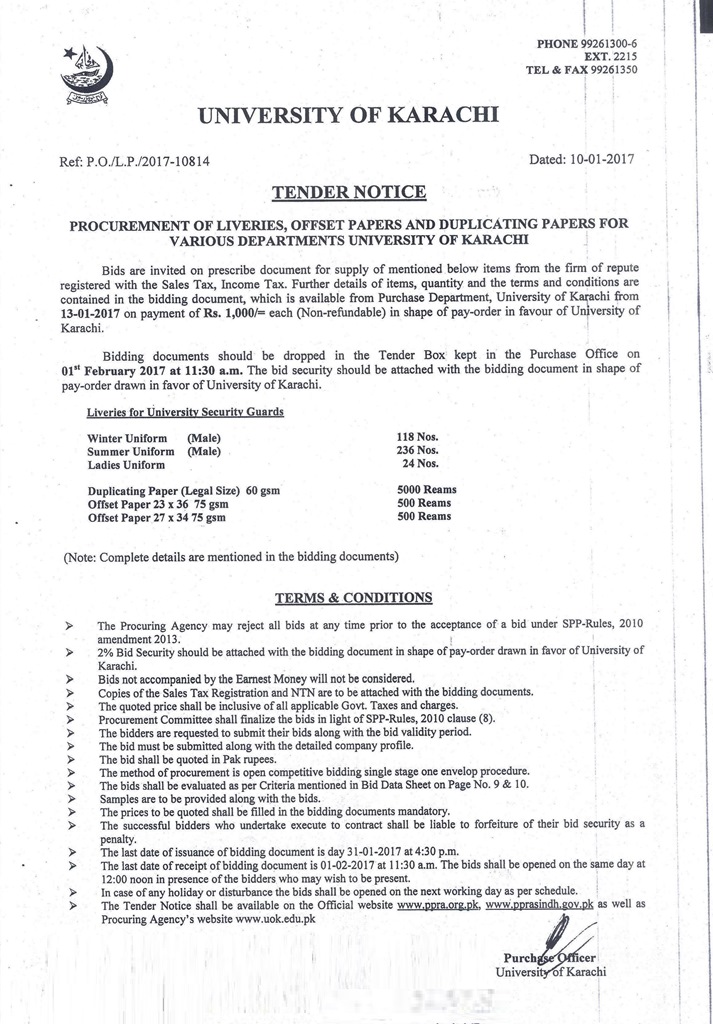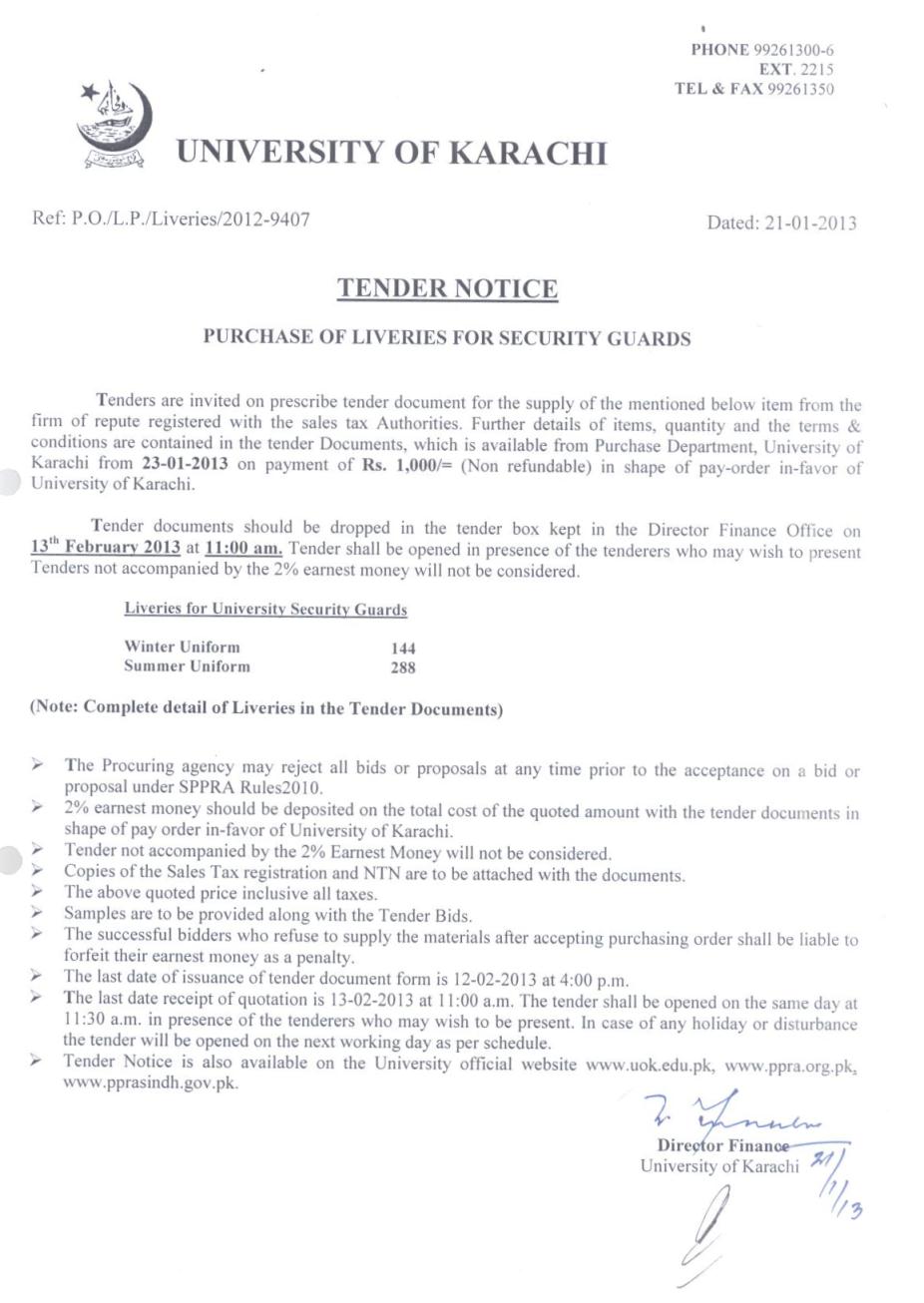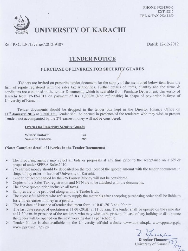 Dated : 28/01/13 Tender : Purchase of liveries of security guards :: Notice |
