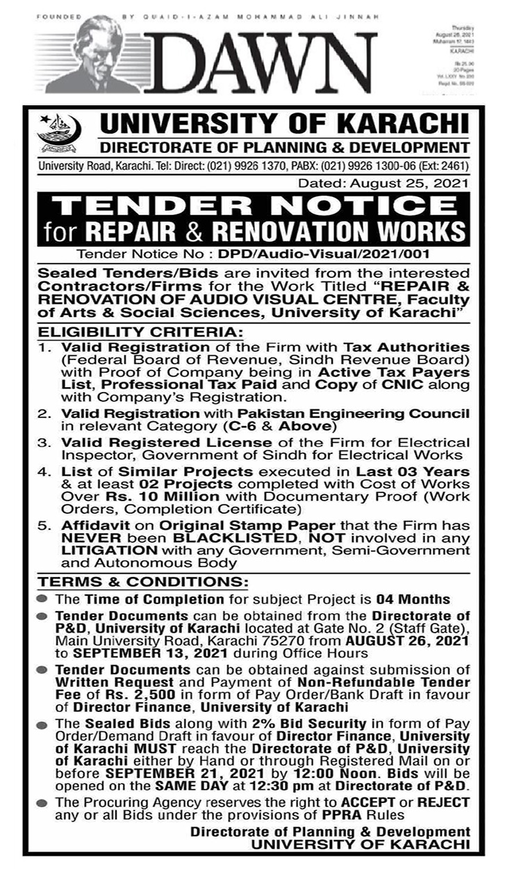 Dated : 25/08/21 Tender : Notice | Form: V.C Office | Examinations Department | BCC&T Press | Faculty of Management |