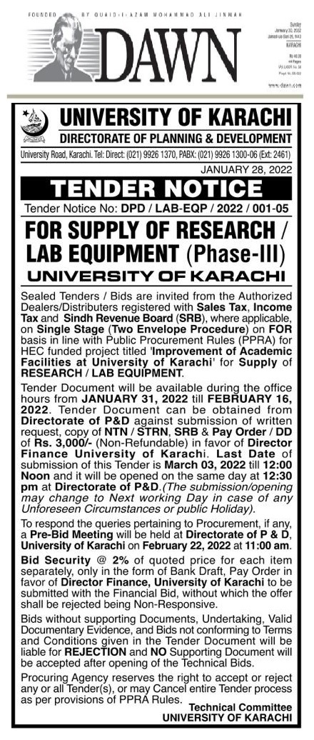 Dated : 27/01/23 Tender Lab Equipment Phase-V & PMU : Notice |