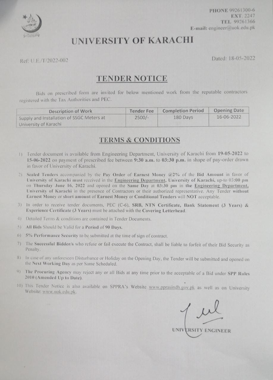 Dated : 19/05/22 Tender : Supply and Installation of SSGC Meters - Notice | Form |