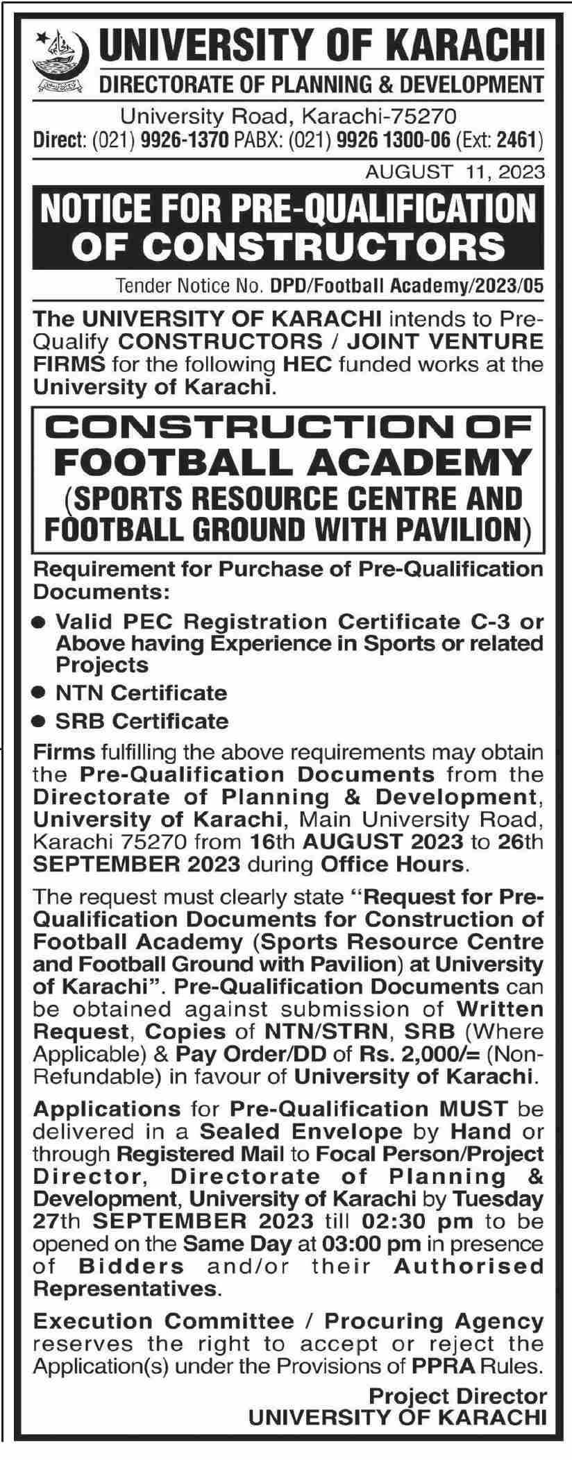 Dated : 27/10/23 Notice for Prequalified Constructors for Construction of Football Academy (DPD/Football Academy/2023/05) : Notice |